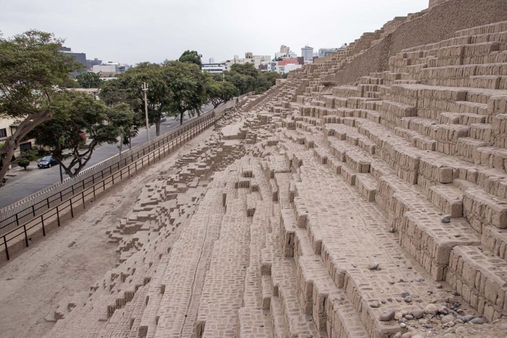 Huaca Pucllana is a pre-Inca pyramid in the Miraflores District of Lima. It dates to around 200-700 BC and is made of adobe brick.